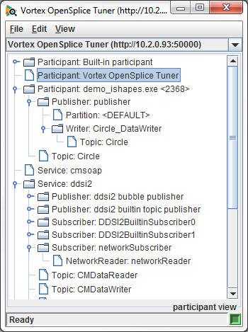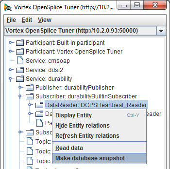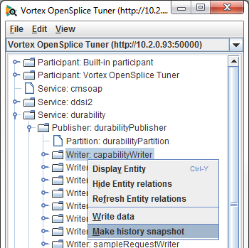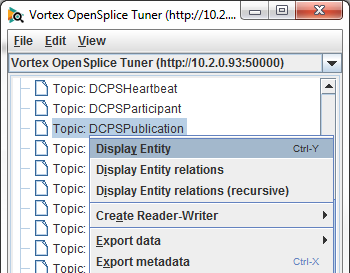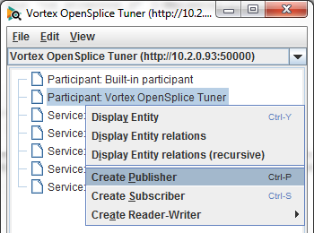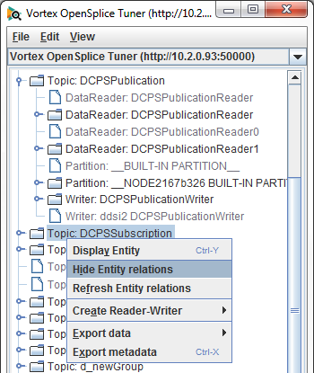 To be able to use the OpenSplice system for the distribution of data, applications need to create all kinds of entities. Entities are, for instance: domain participants, subscribers and publishers. The OpenSplice system administers these entities. Each entity type has its own characteristics (attributes, status, QoS policies, data type) and relations to other entities. OpenSplice Tuner provides facilities to observe entities in the OpenSplice system and browse over their (mutual) relationships using different views (see Entity Relationships).