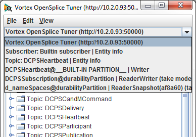 The tuner’s main window is displayed when the Vortex OpenSplice Tuner is started (see The Main Tuner Window).