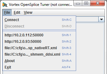 OpenSplice Tuner keeps a history of connections. It remembers four connections per connection at most. The connection history is located in the File menu between the Disconnect and Exit menu items.