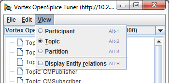 The entity tree in the main window displays the entities in OpenSplice as well as their relationships. The selected view determines which relationships are displayed (see Entity Relationships). The current view name is displayed in the bottom right corner of the entity tree.