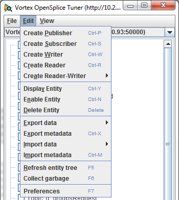 The Edit menu provides facilities to interact with the OpenSplice system.