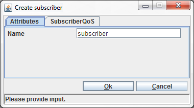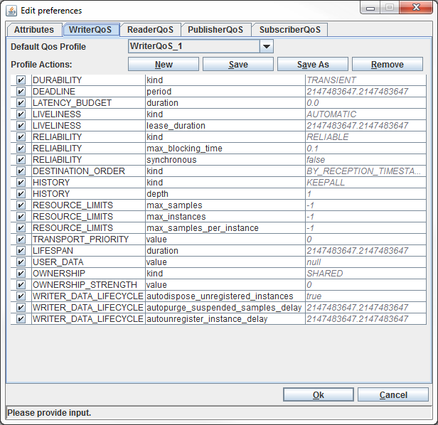 The New button creates a new QoS profile based on the default qos settings as described in the DDS specification for the chosen entity. When the New button is clicked, a dialog box appears for entering a name for the new profile.
