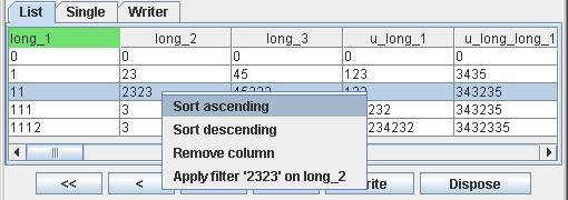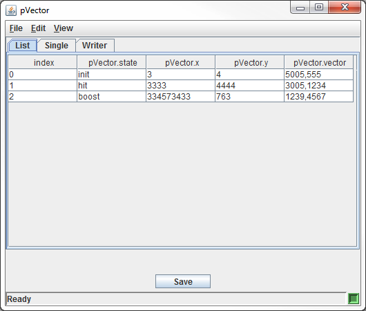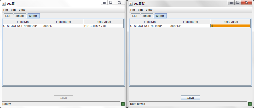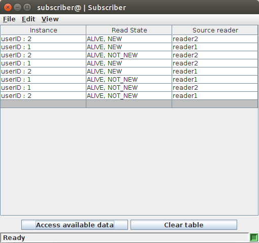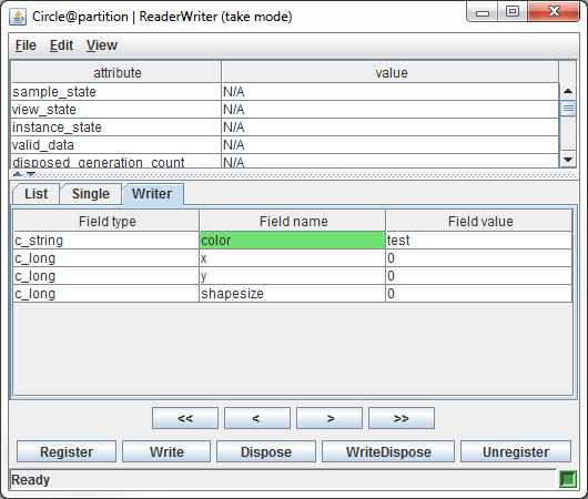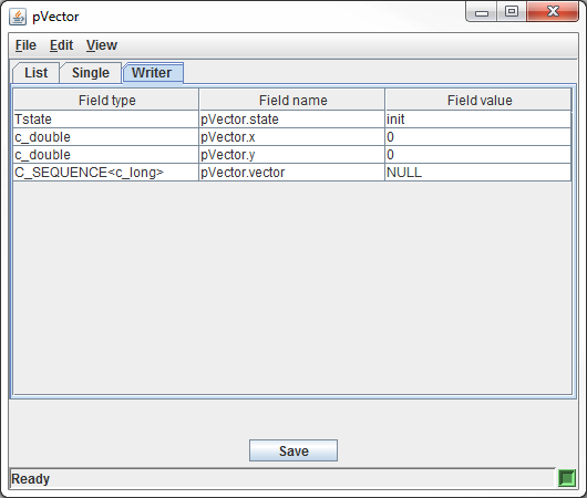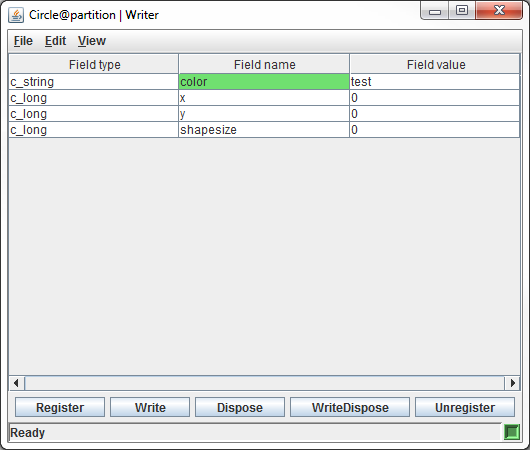 Once selections are complete and the reader or writer window appears, the user data model is populated with type fields and values that are decoded according to the type evolution that was chosen. An additional table highlight colour is shown in cyan where fields are defined as required in the protobuf type definiton. Topic key fields are still coloured green and are implied to be requried. All other unhighlighted fields are optional fields.