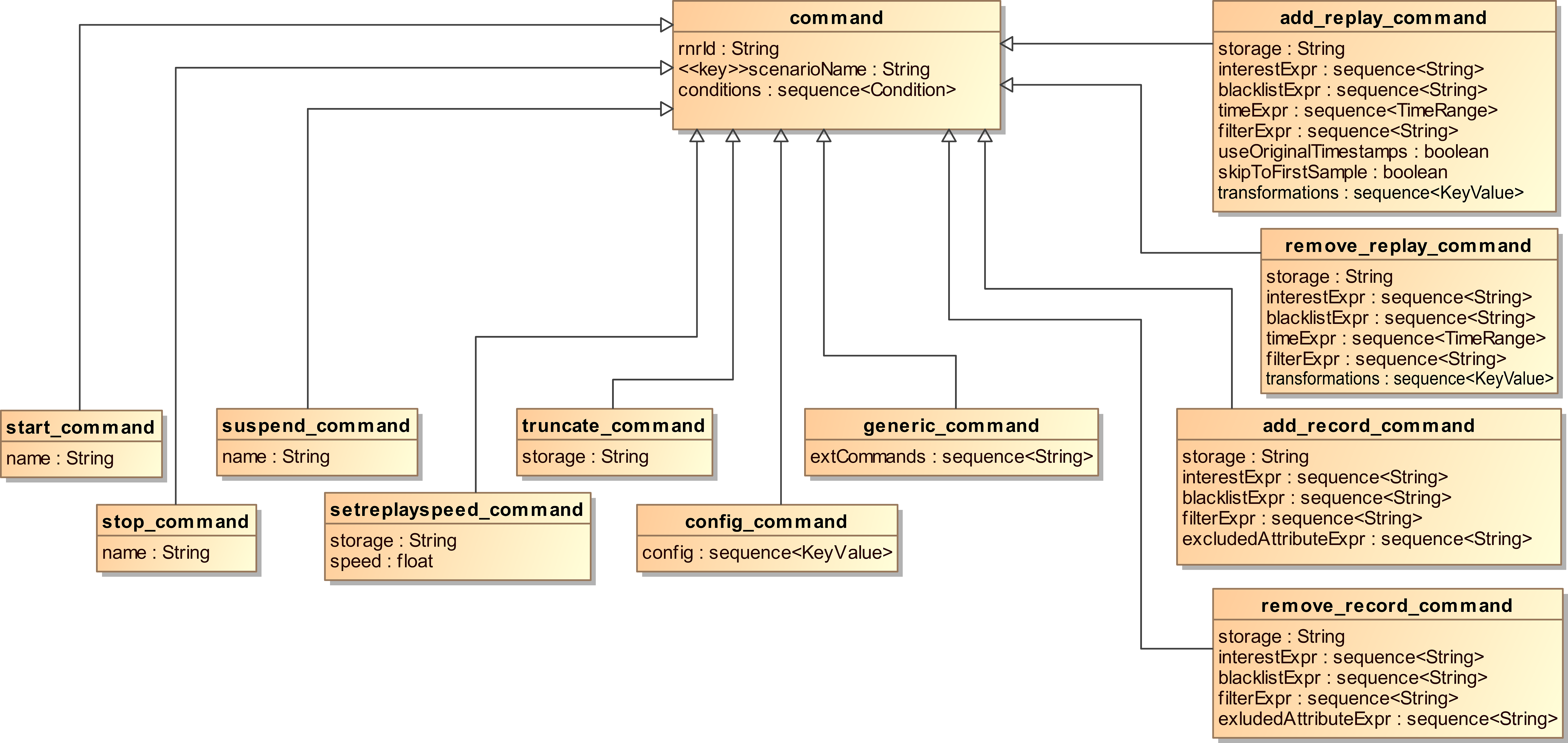 rnrIdis used to address the command to a specific RnR service. It should match the name attribute of the service tag in the OpenSplice configuration. The middleware uses this identifier to resolve the configuration options that apply to the service. A RnR service only accepts commands with an rnrId that matches its service-name. An asterisk*can be used as rnrId for commands targeted at all available RnR services in a domain.- scenarioName